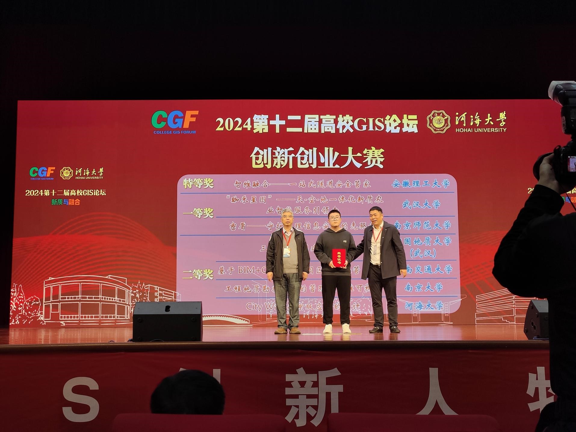 积极遴选组织学生,精心打磨培育项目,两个团队参加分论坛四:GIS融合创新与产业成长(创新创业大赛)决赛角逐。在名校荟萃、高手云集的决赛现场,《智维融合-一站式隧道安全管家》团队凭借独特的创新思维、缜密的创业逻辑、精彩的汇报答辩脱颖而出,荣获创新创业大赛唯一的特等奖;《冠舟-智慧环境监测专家》团队荣获创新创业大赛三等奖。
