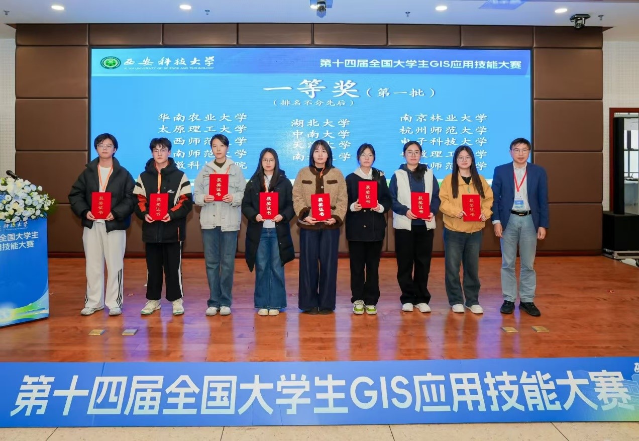 2025年11月14日至16日,第十四届全国大学生GIS应用技能大赛在西安科技大学隆重举行。经过激烈角逐,由百合小说 2023级地理空间信息工程专业何秀君、杨睿、马政楠、赵程烨四位同学组成的参赛团队,在李冠男、卢秀两位老师的悉心指导下,凭借扎实的专业功底、娴熟的操作技能和出色的团队协作,从众多强校中脱颖而出,荣获全国一等奖,为学校赢得了荣誉。这是百合小说 在该项竞赛中连续两年荣获一等奖,充分展现了学校在GIS领域教学的显著成效。
