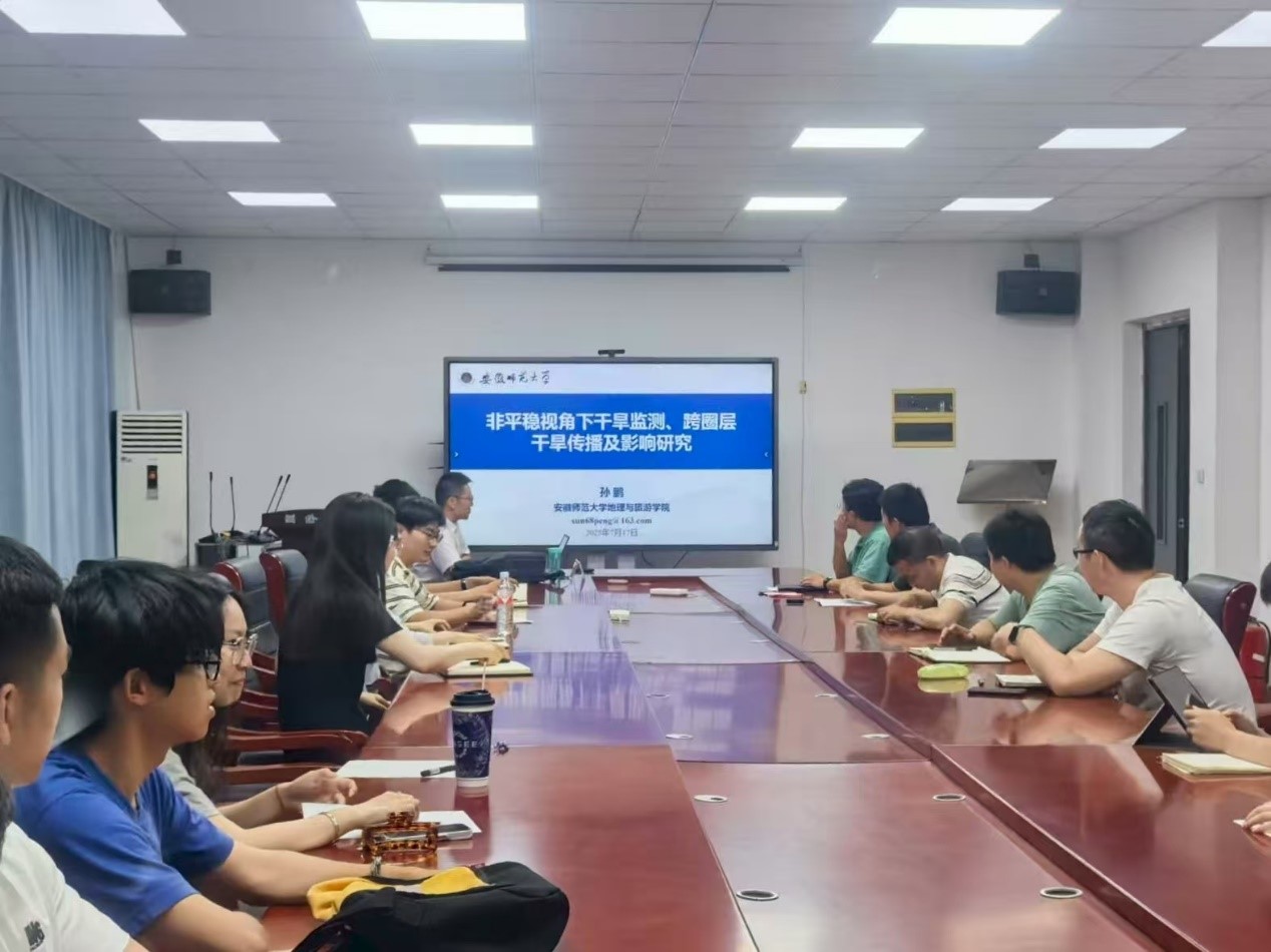 为促进学术交流,拓展地理信息科学前沿视野,7月17日下午,应百合小说 邀请,安徽省“领军人才”特聘教授、安徽省优秀青年基金获得者、安徽省优秀青年研究生导师,安徽师范大学孙鹏教授莅临百合小说 ,在求本楼北503会议室作题为《非平稳视角下干旱监测、传播及影响研究》的学术报告。报告会由学院副院长王世航主持,学院部分青年教师、研究生20余人聆听了报告。