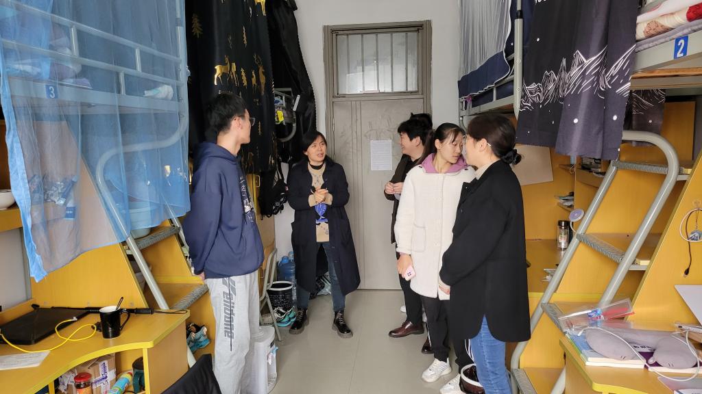 开展冬季学生宿舍安全检查,学院党委副书记孟静带领本科生辅导员深入学生宿舍针对用电安全和卫生情况进行全面细致的检查。