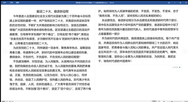 本次活动于线上进行,面向学院全体学生,参赛同学按规定投稿。征文中,同学们饱含爱党、爱国、爱社会主义的情感,字里行间都传达着对党和国家的感恩,对未来的期许,生动诠释了“奋进新征程,建功新时代”的青春担当。